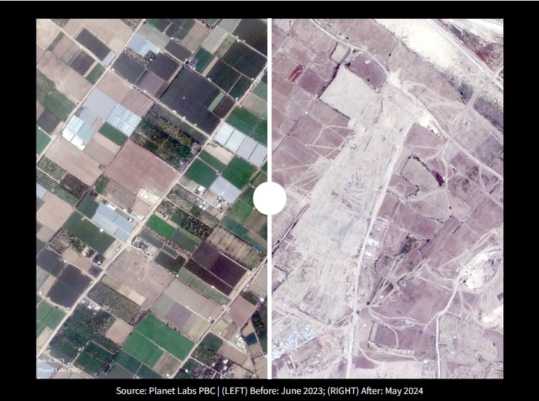 Satellite images show the once-fertile regions of Beit Lahiya- known for its juicy strawberries that locals called “red gold”- are now destroyed with vehicle tracks and barrenness.