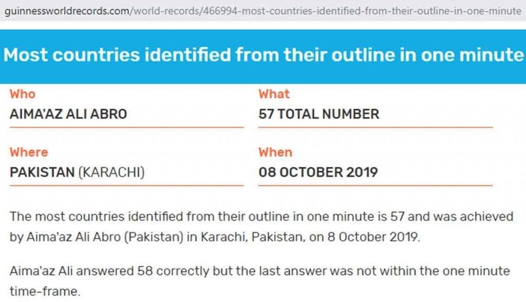 A post on the Guinness World Record reads, “The most countries identified from their outline in one minute is 57 and was achieved by Aima’az Ali Abro in Karachi, Pakistan, on 8 October 2019.”