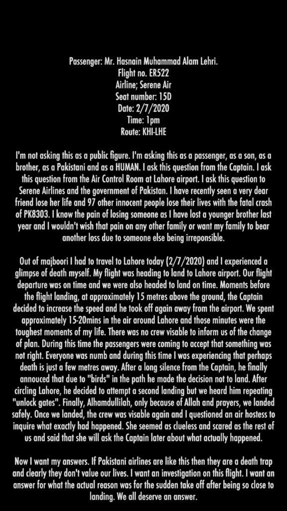 Renowned model Hasnain Lehri, in a Twitter post, shared a harrowing flight experience with Serene Airlines and demanded that he wants answers as to why the pilot decided to increase speed and take off again moments before landing. Detailing his ordeal, Lehri said that he experienced “a glimpse of death”.