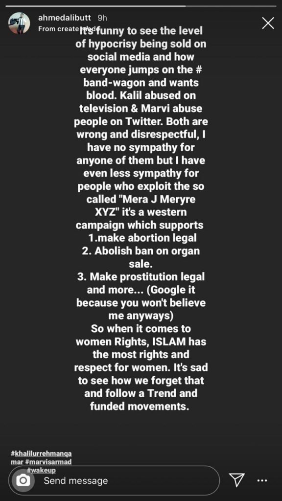 In a lengthy message posted to social media, Butt said while he has no sympathies for Khalil ur Rehman Qamar or Marvi Sirmed, he has even little sympathy for the “people who exploit the so-called ‘Mera J Mery XYZ’, adding that it is a western campaign. The actor stated that “When it comes to women’s rights, Islam has the most rights and respect for women.”