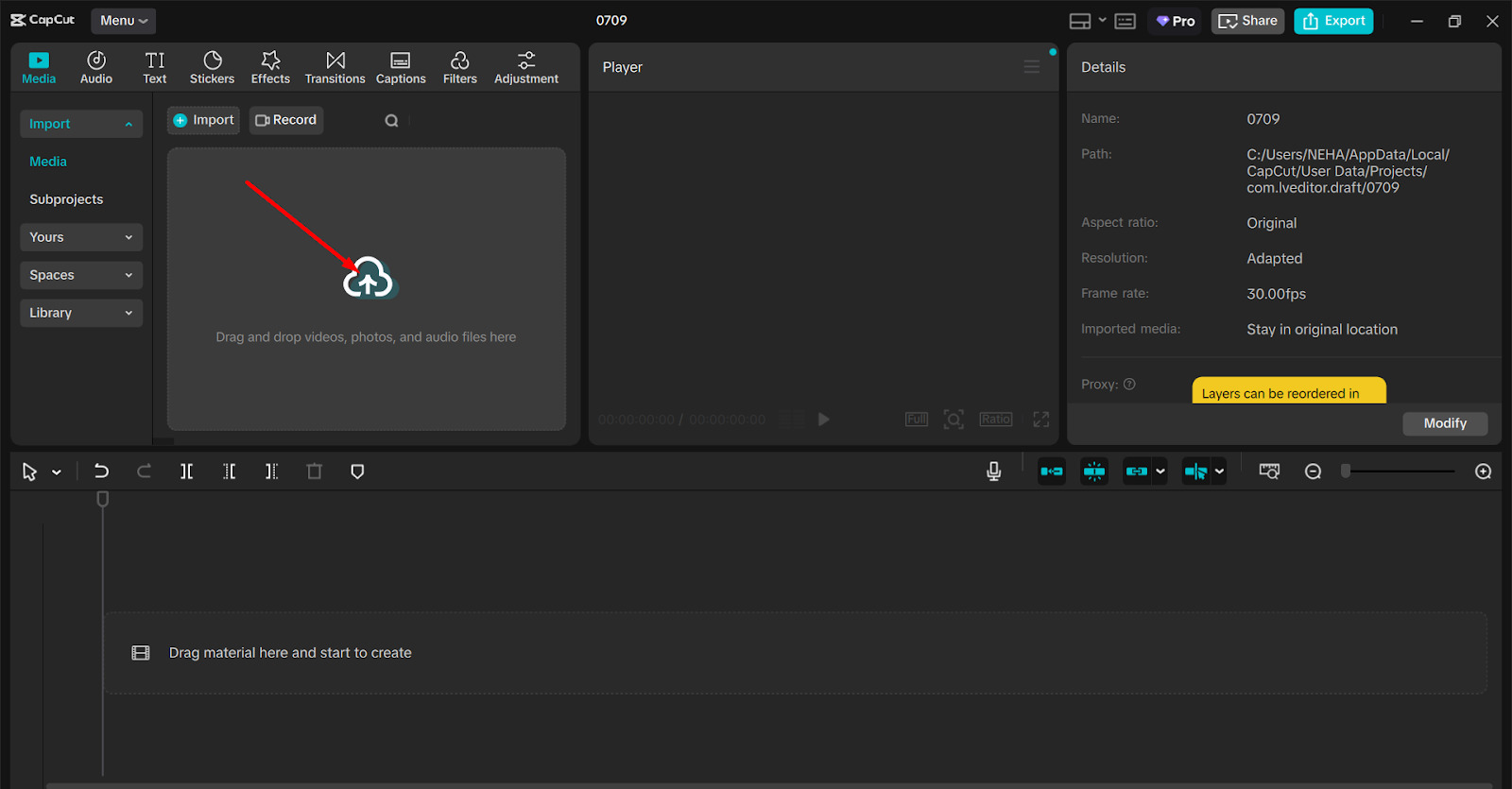 The first thing youโll need to do is import the video you want to improve. Open CapCut on your desktop, and click on the โImportโ button. Find the video on your computer and add it to your CapCut workspace.