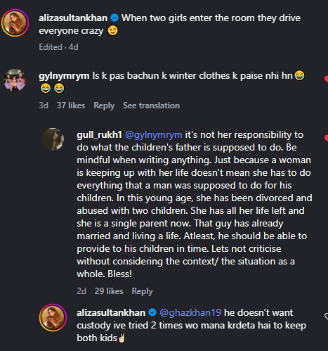 Responding to this comment, Aliza Sultan wrote, "He doesn't want custody. I've tried 2 times wo mana krdeta hai to keep both kids✌🏻 [He refuses to keep both kids]."