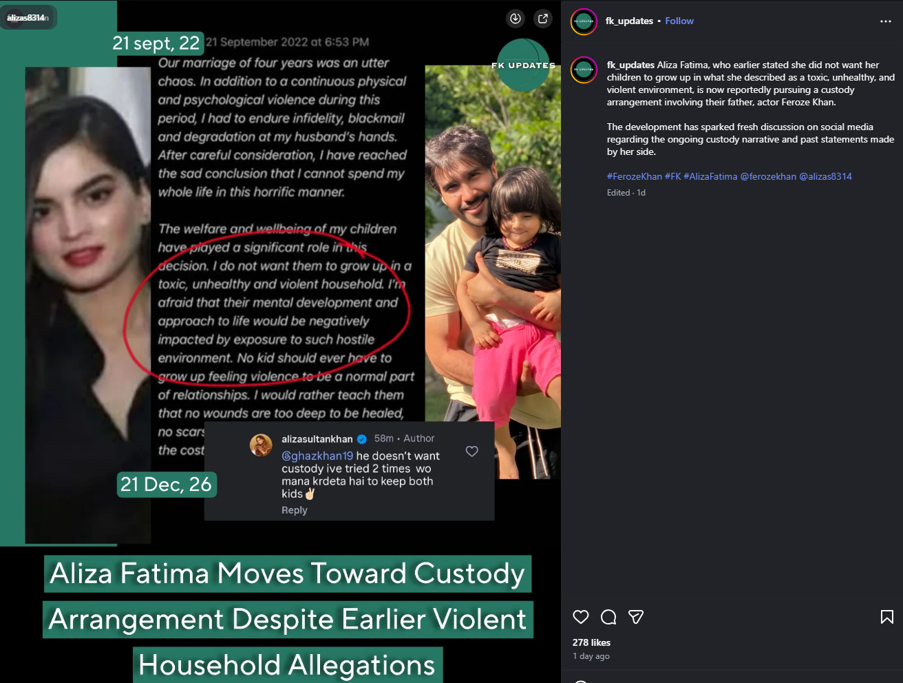 In March 2024, the former couple reached a custody settlement after an 18-month legal battle. Under the agreement, their son Sultan lives with Feroze Khan, while their daughter Fatima stays with Aliza Sultan. Feroze Khan agreed to pay PKR 75,000 monthly for Fatima's expenses, with a 10 percent annual increase.