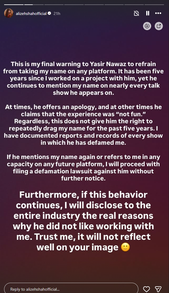 “This is my final warning to Yasir Nawaz to refrain from taking my name on any platform. It has been five years since I worked on a project with him, yet he continues to mention my name on nearly every talk show he appears on [sic],” she wrote.
