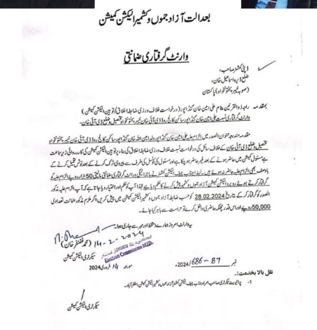 A case was filed Gandapur for violation of code of conduct in Azad Kashmir elections. Deputy Commissioner Dera Ismail Khan has also been issued an arrest warrant for the PTI leader,in which he has been directed to appear before the Election Commission of Azad Kashmir on February 28.