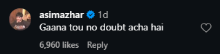 Among thousands of other reactions, Asim himself jumped into the comments section, writing, "Gaana tou no doubt acha hai [The song is no doubt good]."