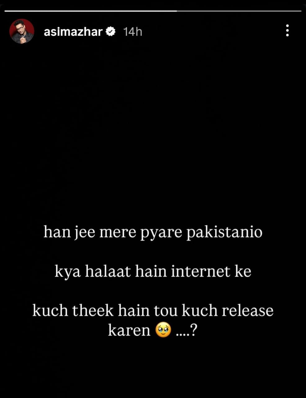 Taking to Instagram stories, Asim wrote: “Han jee mere pyare Pakistanio. Kya halaat hain internet ke? Kuch theek hain tou kuch release karen…?” (Hey my dear Pakistanis. What’s the internet situation like? If it’s somewhat okay, should we drop something?)