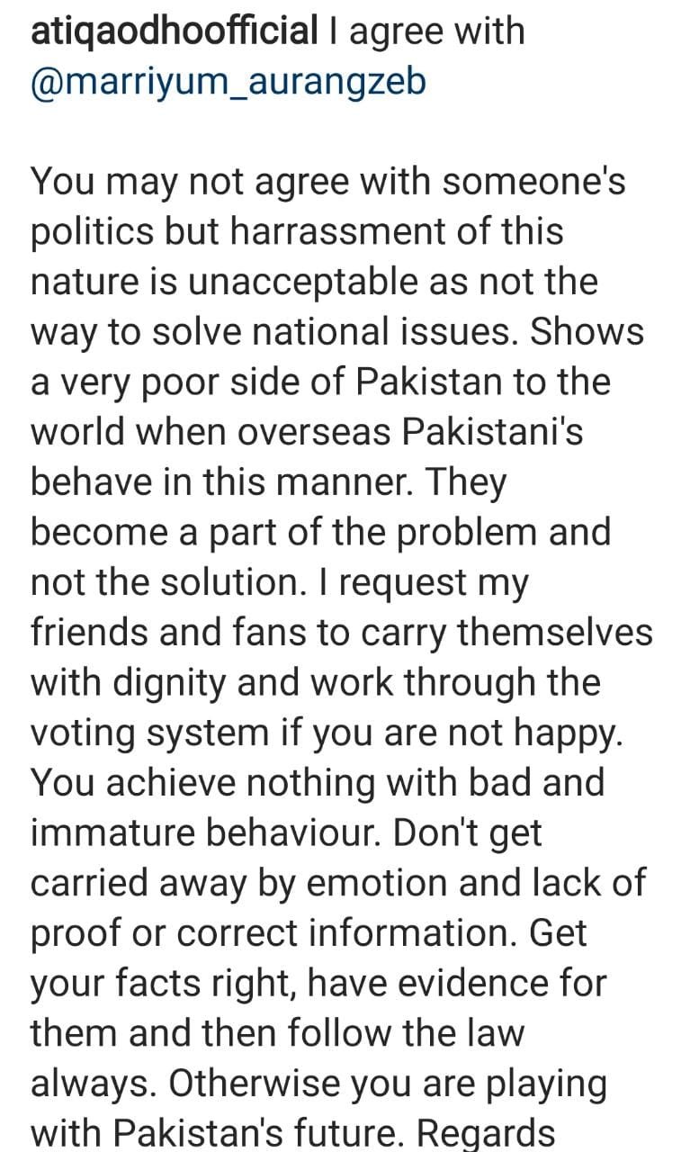The Pyar Ke Sadqay star wrote, “You may not agree with someone’s piolitics but harrassment of this nature is unacceptable as this is not the way to solve national issues.”