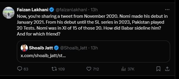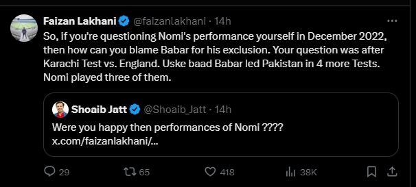 Faizan Lakhani replied woth an old video of Shaoib in which he criticised Noman Ali for not taking wickets. Faizan wrote, “You, too, were not happy with Nomi, nai?”