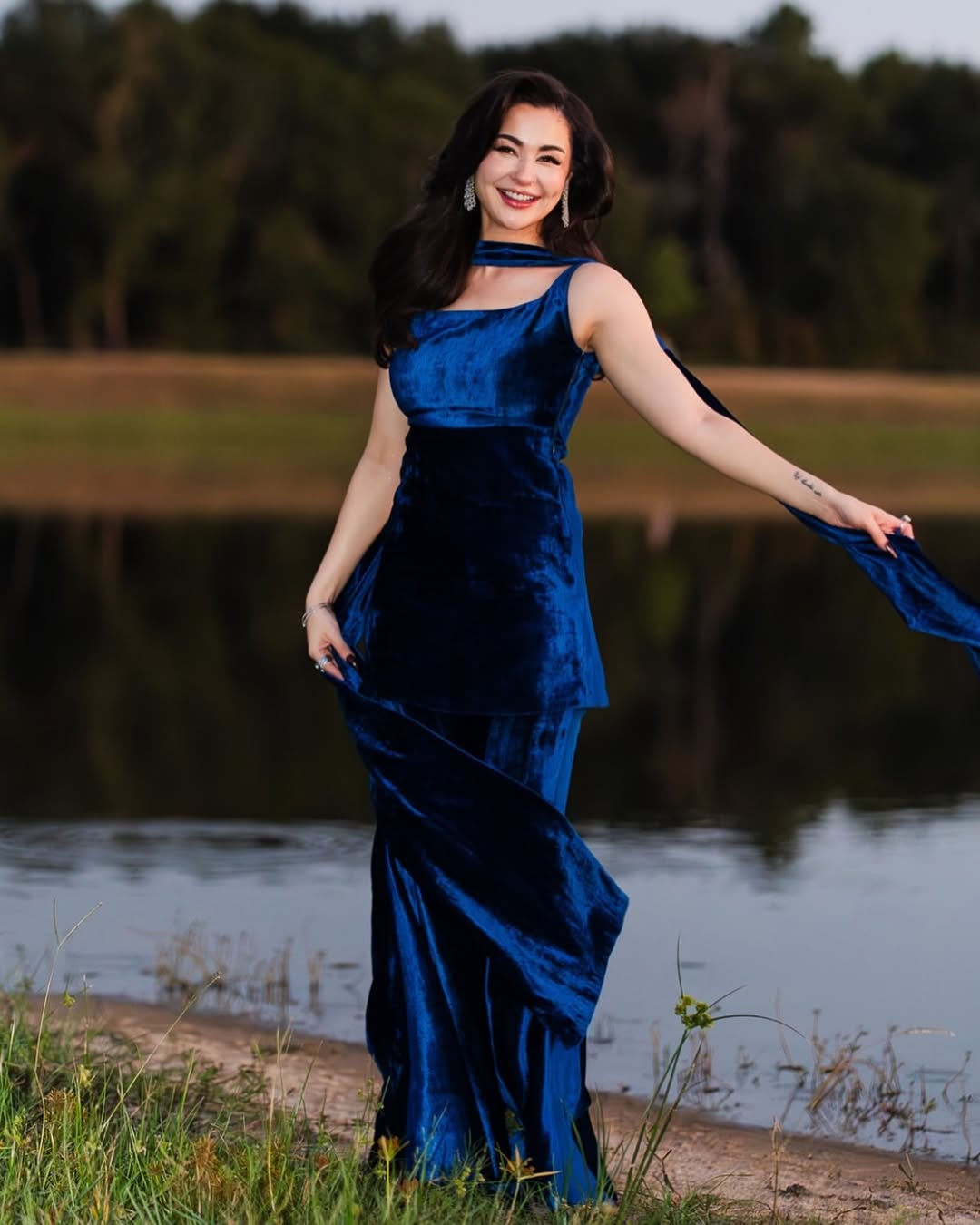 Always a charmer, Hania Aamir made a strong statement in a velvet blue ensemble by Mihha. The look included a sleeveless short shirt, bell-bottom culottes, and a dupatta elegantly draped around her neck. Her silver earrings from Sherezad Rahimtoola added just the right touch of sparkle. She kept her hair loose, complementing the effortless glam.