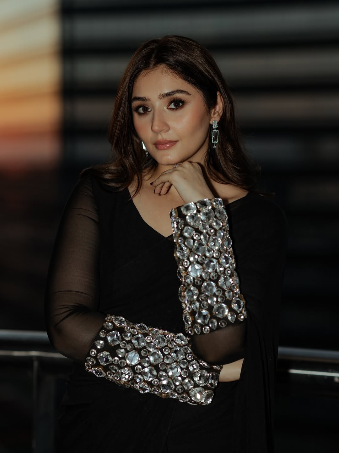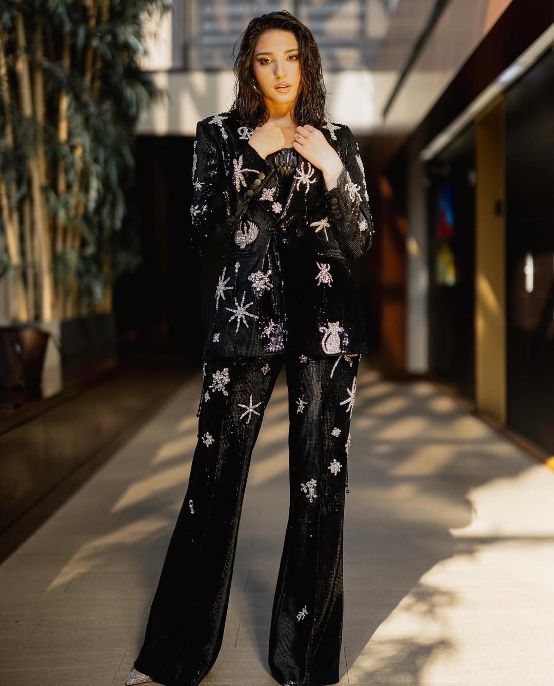 Ramsha Khan stepped out in a bold, black suit by Nomi Ansari, featuring sequin and silver bead embroidery. Her wet-hair look and dramatic eye makeup gave a sharp, high-fashion edge to her appearance, standing out with confident flair.