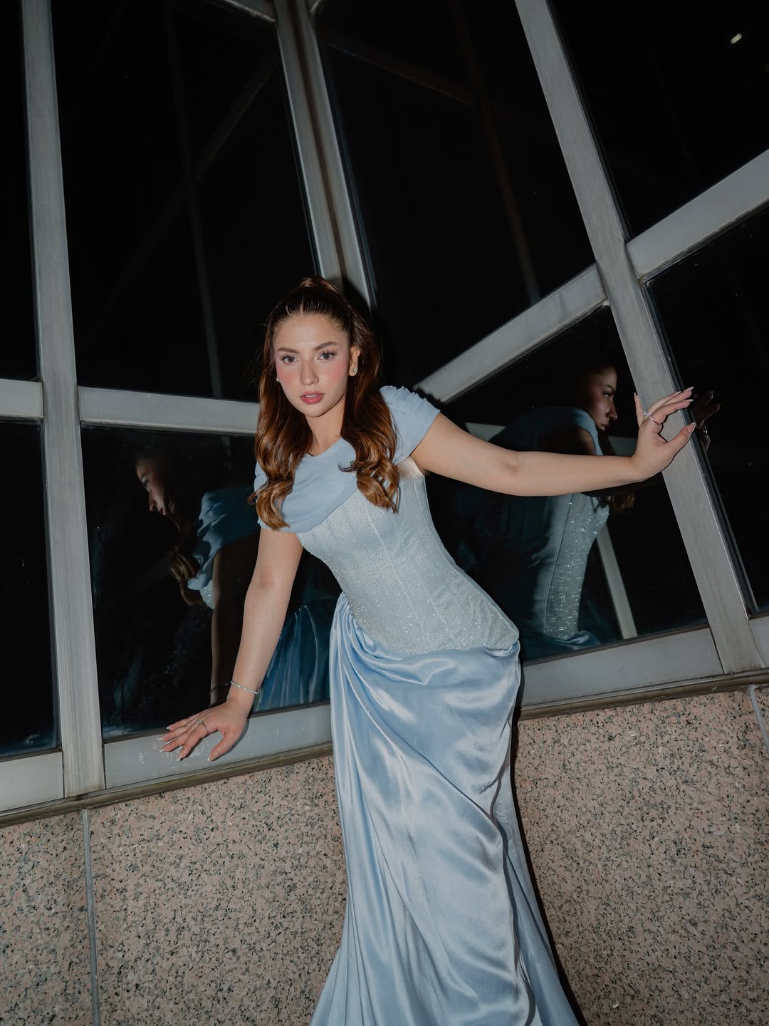 Dananeer embraced the "party ho rahi hai" spirit in a silk blue gown by Ahmed Manan. With her hair tied in a sleek high ponytail and a minimalist makeup look, she radiated youthful charm and energy.