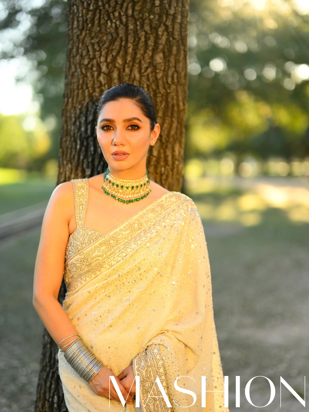 A timeless icon, Mahira Khan chose an ivory georgette saree by Iqbal Hussain adorned with intricate silk thread and lurex aari embroidery. The hand-embroidered borders, stonework, and subtle sequin spray exuded elegance. With a vintage-inspired side-parted bun, soft smoky eyes, and nude lips, Mahira embodied classic glam. She accessorised the gorgeous apparel with minimal silver jewelry by Sherezad Rahimtoola and silver bangles for a perfect blend of tradition and modernity.