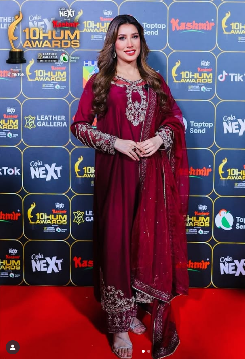 Known for her impeccable style, Mehwish Hayat surprised many with a red embroidered three-piece shalwar kameez by Hafsa Imran Khan. While her commitment to elegance and culture is admirable, the outfit lacked the glamour typically expected at such an event. She wore her hair down with a center part and paired the outfit with red beaded earrings.