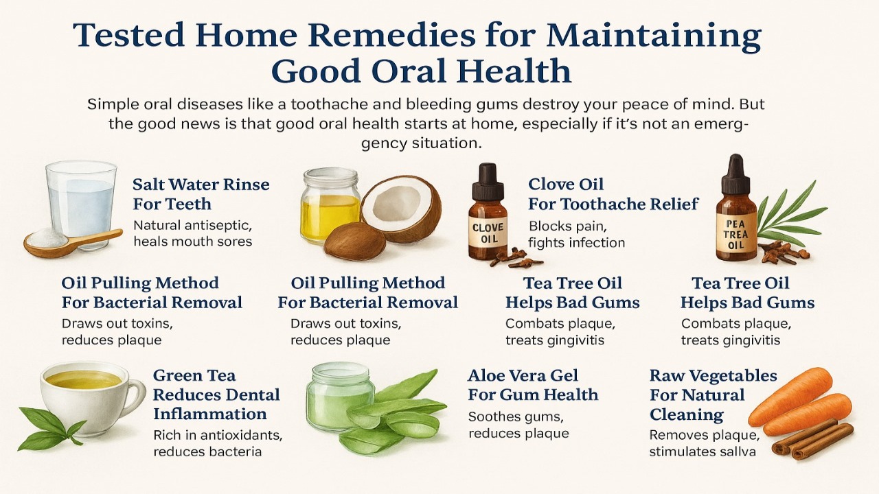 Simple oral diseases like a toothache and bleeding gums destroy your peace of mind. But the good news is that good oral health starts at home, especially if it’s not an emergency situation. Home remedies for teeth and gums include natural ingredients like green tea, tea tree oils, green vegetables, etc. Get your hands on these tried and tested home solutions for your oral health and reduce the risk of serious medical emergencies.