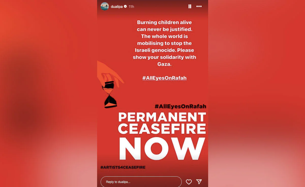 Lipa said, “The whole world is mobilising to stop the Israeli genocide, please show your solidarity with Gaza.”