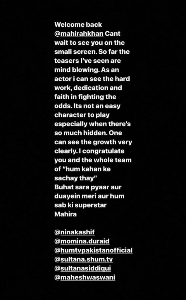 “One can see the growth very clearly,” adding, “I congratulate you and the whole team of Hum Kahan Ke Sachay Thay, buhat sara pyaar aur duayein meri aur hum sab ki superstar Mahira,” she wrote while congratulating the Humsafar star.