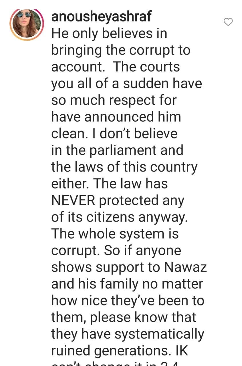 The talented actress stated that Imran cannot change the economic crises that were resulted due to PML-N’s shortcomings. She also wants Nawaz to quit politics. Anoushey mentioned that she no more believes in the justice system of Pakistan.