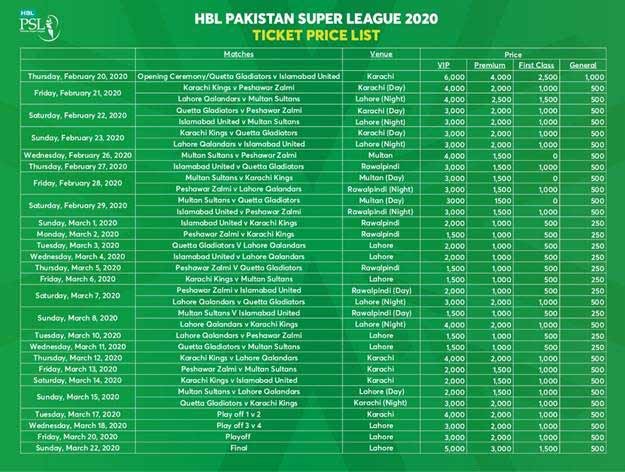 For the grand opening ceremony and opening match in Karachi that is on Feb 20, tickets have been priced between Rs1,000 to 6,000. The ticket price range for the final match on March 22, in Lahore, will be from Rs 500 to Rs 5,000.