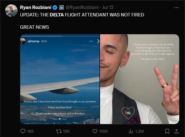 The flight attendant in the picture also posted a picture of him making a victory sign with the caption, “Thank you to everyone for all of the kinds messages. It has been an overwhelming few days but I’m grateful for all of the love and support. See you in the skies!”.