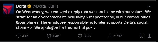 However, Delta removed the tweet recently. “On Wednesday, we removed a reply that was not in line with our values. We strive for an environment of inclusivity and respect for all, in our communities and our planes. The employee responsible no longer supports Delta’s social channels We apologize for this hurtful post.”