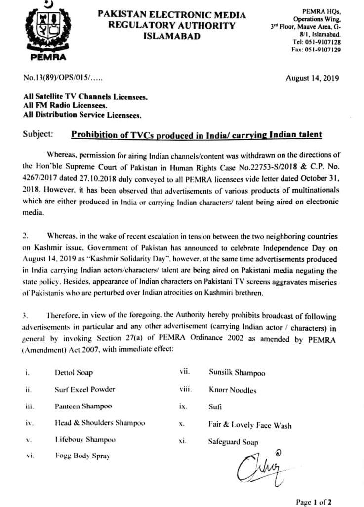 Yes, it sure did. Pakistan’s Electronic Media Regulation Authority (PEMRA) has banned Pakistani television channels from airing advertisements with Indian actors, characters and talent because of the recent escalation of Indian aggression in occupied Kashmir.