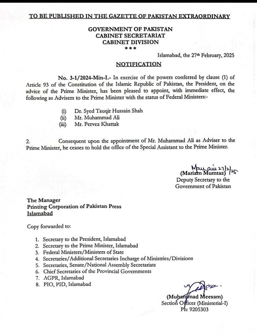 As per the notification, after appointing Mr Muhammad Ali as an advisor to the PM, he ceases to hold the office of the Special Assistant to the Prime Minister (SAPM).