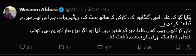 Journalist Waseem Abbasi corrected himself after sharing the old video clip, noting he had been informed that the video of Gandapur arguing with party workers was from a previous incident, and he deleted the post accordingly.
