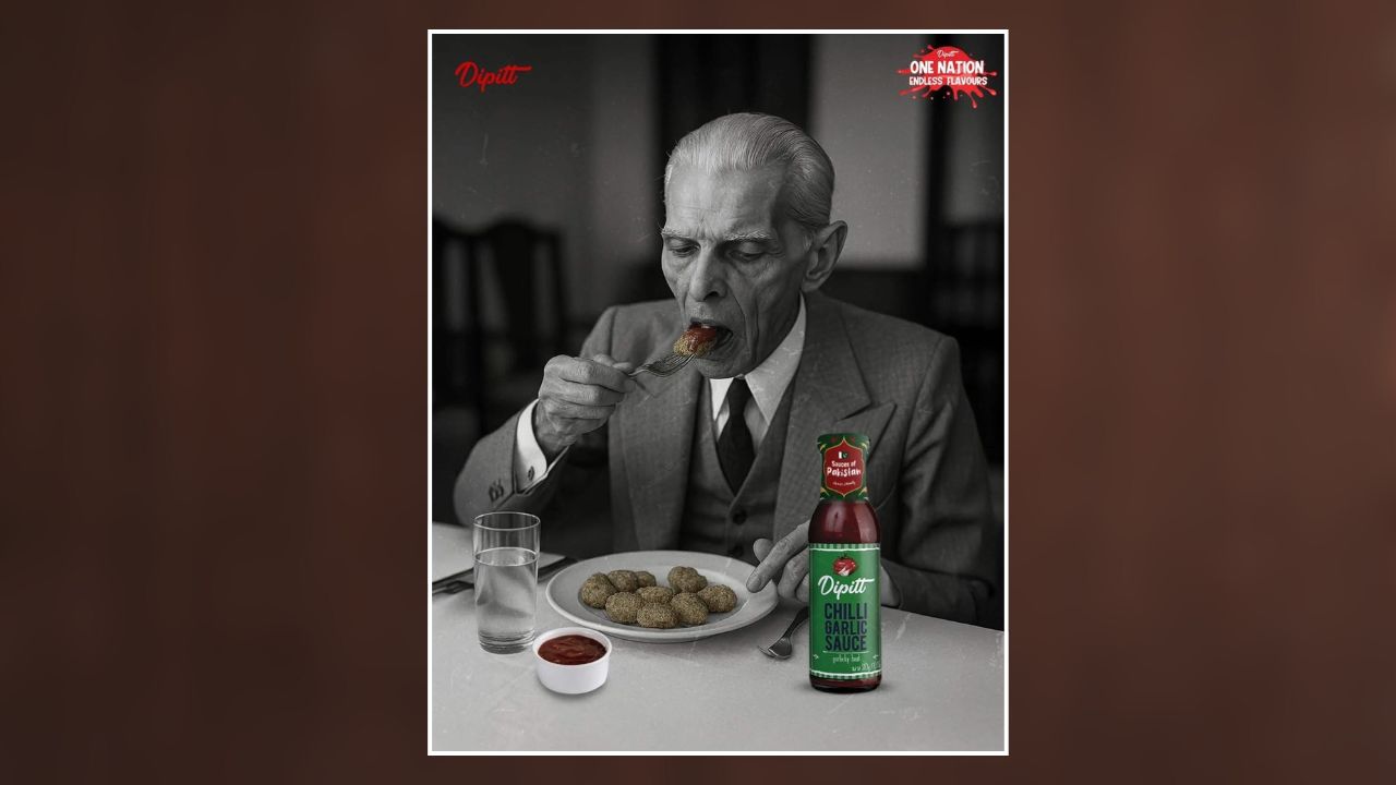 A screenshot of a now-deleted Dipitt ad, generated using artificial intelligence (AI), has been circulating on social media. The ad, allegedly shared from the sauce brand’s official accounts, featured Pakistan’s founder, Quaid-i-Azam Mohammad Ali Jinnah, appearing to eat food with a bottle of Dipitt’s chilli garlic sauce on the table.