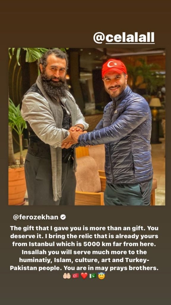 Feroze Khan has thanked Diriliş: Ertuğrul star Celal AL for all the love and “priceless gifts” he brought for him on his visit to Karachi.