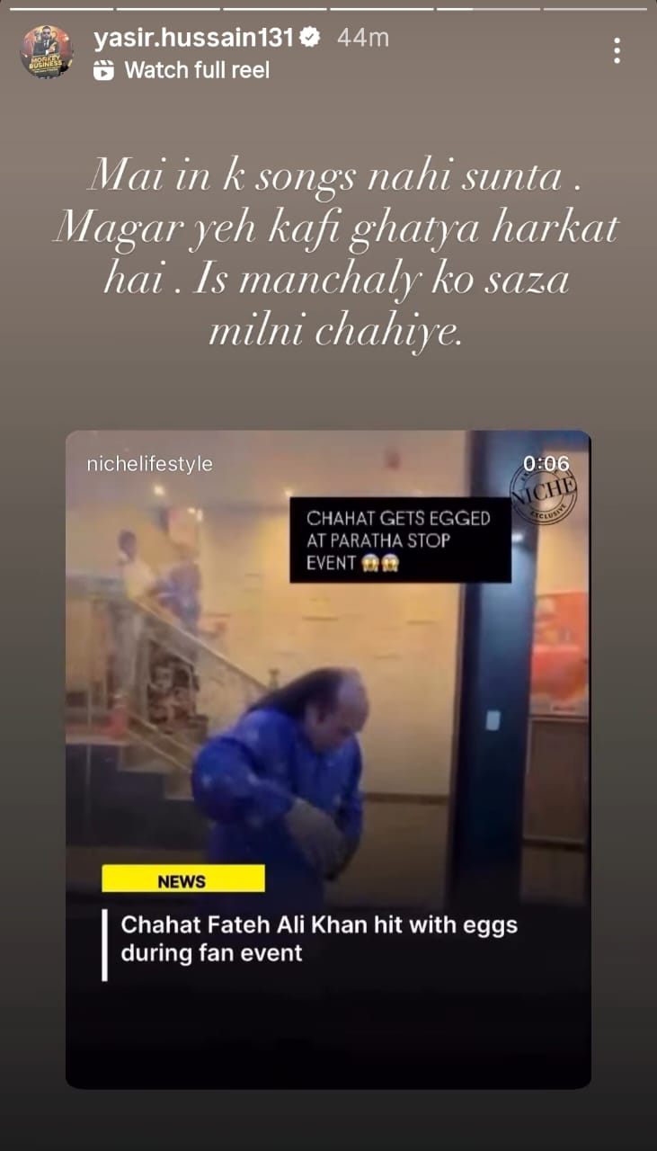 Actor and writer Yasir Hussain posted on his Instagram story, saying: “Main in k songs nahi sunta. Magar yeh kaafi ghatya harkat hai. Is manchalay ko saza milni chahiye” (I don’t listen to his songs, but this is a disgusting act. The person responsible must be punished).