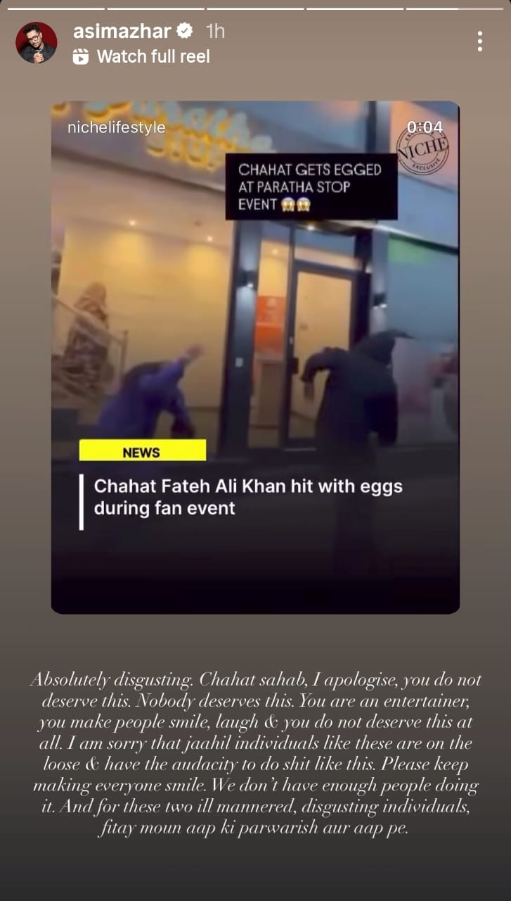 Singer Asim Azhar took it a step further by apologising directly to Chahat via his Instagram story: “Nobody deserves this. You are an entertainer, you make people smile, laugh, and you do not deserve this at all.”