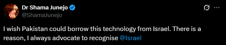 In another post, on January 11, 2023, she wrote, “I wish Pakistan could borrow this [National water carrier] technology from Israel. There is a reason I always advocate to recognize Israel (sic).”
