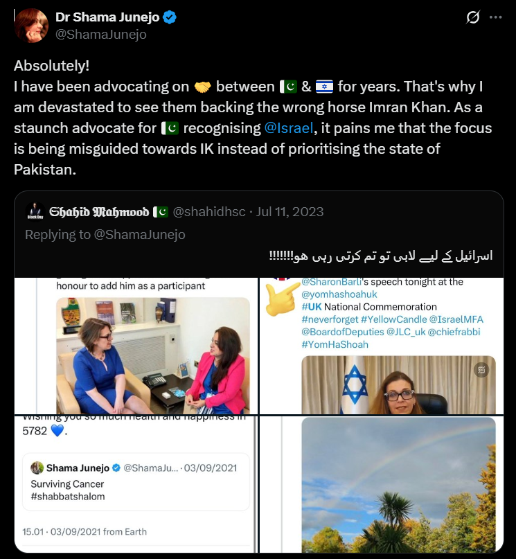 On July 11, 2023, Shama tweeted: “Absolutely. I have been advocating on 🤝 between 🇵🇰 and 🇮🇱 for years. That is why I am devastated to see them backing the wrong horse, Imran Khan [former premier]. As a staunch for Pakistan recognizing Israel, it pains me that the focus is being misguided towards IK [Imran Khan] instead of prioritizing the state of Pakistan.”