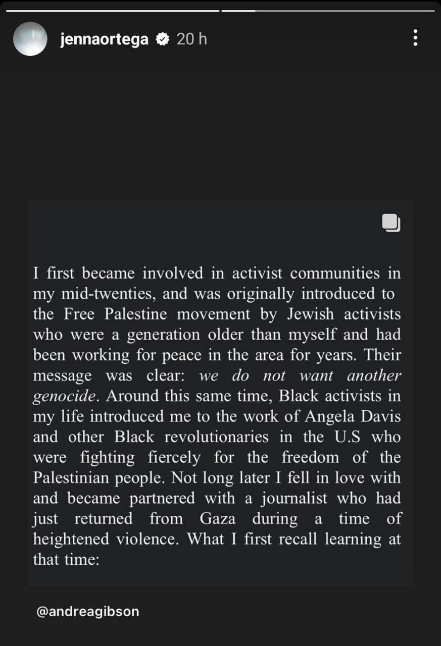 Jenna Ortega, who is the star behind Netflix’s critically acclaimed series ‘Wednesday’ has remained a staunch supporter towards creating a free state for the Palestinians. She re-shared a post calling for an end to the ongoing genocide by a page called Jewish Voice For Peace.