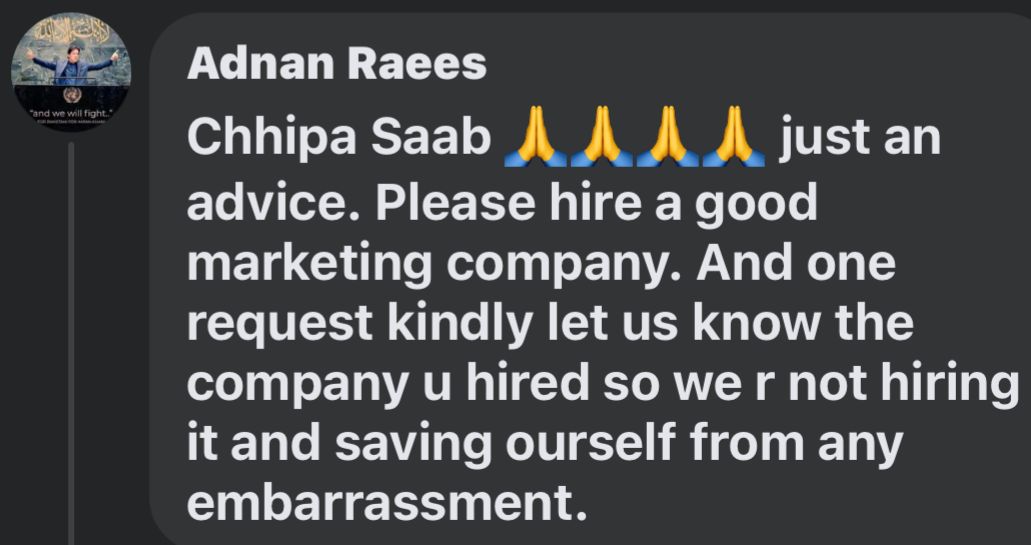 “Chhipa Saab! Just some advice. Please hire a good marketing company. And one request, kindly let us know the company you hired so we are not hiring it and saving ourselves from any embarrassment,” mocked another netizen.