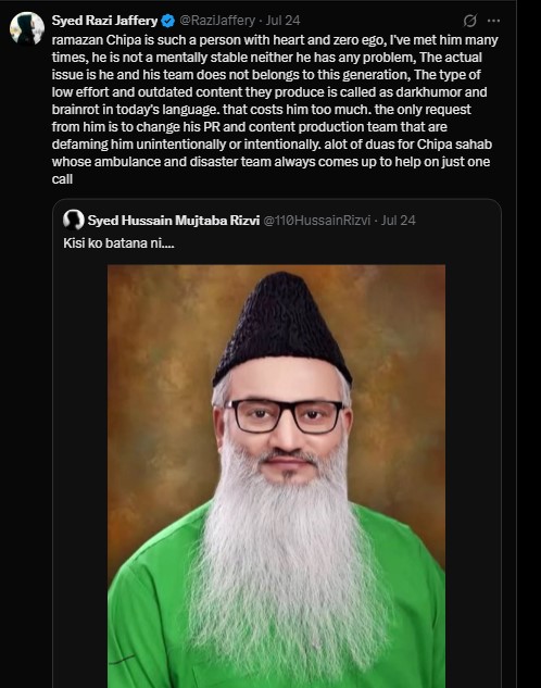 One user, while lauding Chhipa’s work, advised him to change his public relations team, criticising them for producing outdated content in an era dominated by Generation Z: “Ramazan Chhipa is such a person with heart and zero ego, I've met him many times ... The actual issue is [that] he and his team do not belong to this generation. The type of low-effort and outdated content they produce is called dark humour and brainrot in today's language. That costs him too much. the only request from him is to change his PR and content production team, who are defaming him unintentionally or intentionally. A lot of duas for Chhipa sahab whose ambulance and disaster team always come up to help on just one call”.