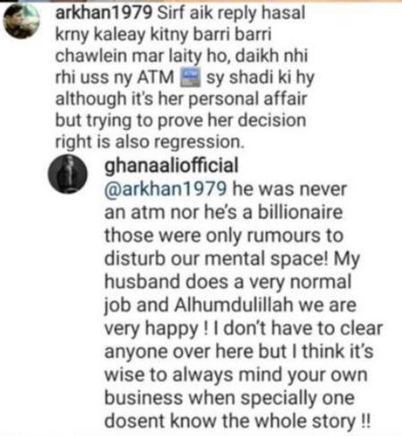 Sun Yaara actor Ghana Ali, who tied the knot with businessman Umair Gulzar, has responded to mean comments of a netizen who claimed that she married him for his wealth.
