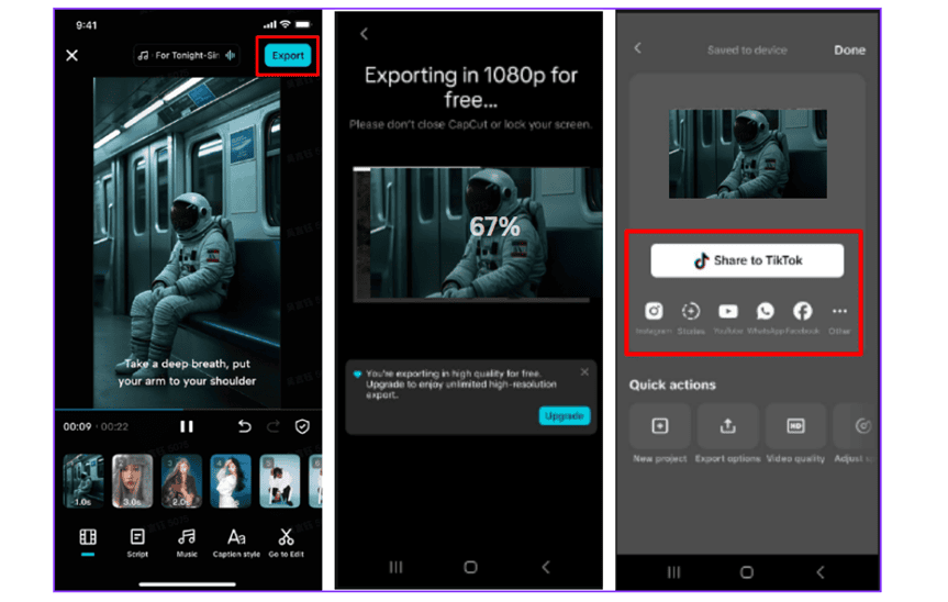 Once you preview your video, tap “Export” in the top-right corner. Your video will be saved to your phone, ready to be shared across TikTok, YouTube, Instagram, Facebook, or any social app you prefer.