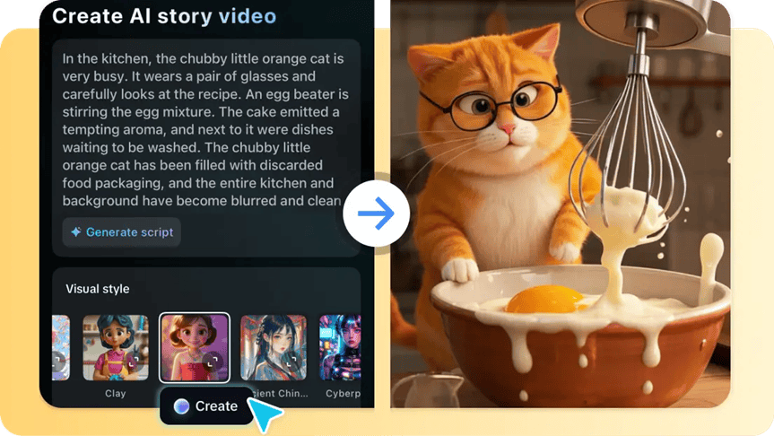Type or paste your script in the “Create AI story video now” section. Then, pick a visual style like Realistic Film, Cartoon 3D, or Anime. You can also add a “Voiceover”, change the “Video ratio”, and hit “Generate” at the bottom once you’re done.