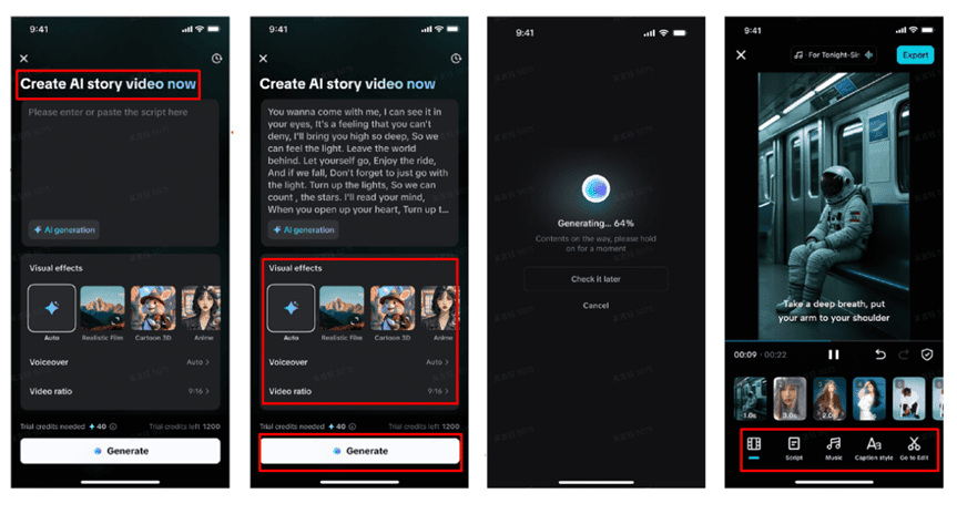 After it creates your story, go to the “Music” tab to insert background music. You can also visit the “Caption style” tab to style your captions with effects, animations, and custom fonts. For advanced edits like filters, stickers, or transitions, tap “Go to Edit” to access CapCut’s full editor.