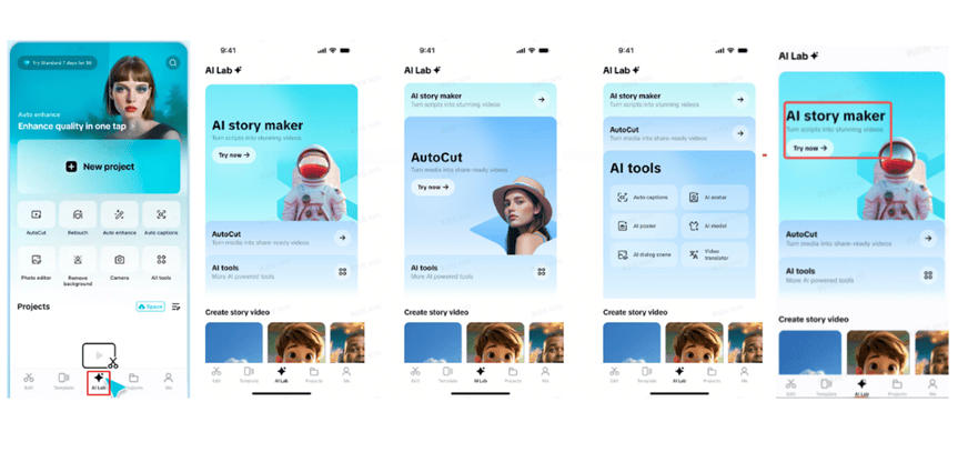 Open the CapCut app and hit the “AI Lab” tab at the bottom of the screen. You’ll find trending AI-powered features such as “AI story maker”, “AutoCut”, and other “AI tools”. Tap on “AI story maker” and select the “Try now” option to begin.