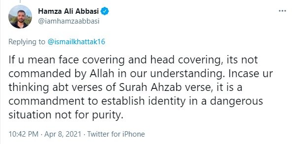 “If you mean face covering and head covering, it’s not commanded by Allah in our understanding,” clarified Hamza. “In case you are thinking about verses of Surah Ahzab, it is a commandment to establish identity in a dangerous situation, not for purity.”