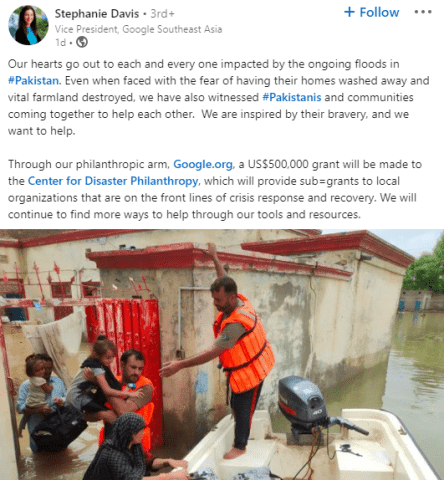 Google Southeast Asia Vice President Stephanie Davis posted on LinkedIn that the tech giant would donate the amount to the Centre for Disaster Philanthropy through Google.org.