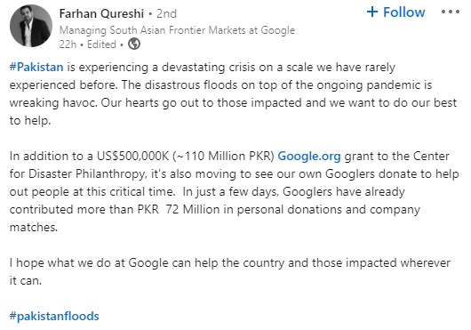“The floods in Pakistan and surrounding areas are devastating humanitarian disasters. Our thoughts are with those that have lost loved ones, the many displaced families, and all those affected,” he tweeted.