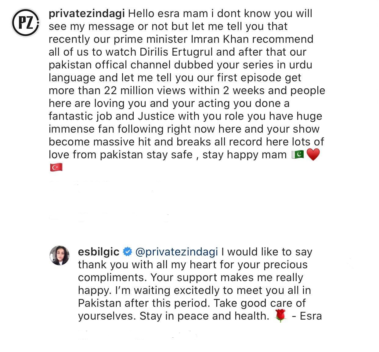Esra Bilgicฬง, who essays the role of Halime Sultan, Ertuฤrul’s wife has now responded to Pakistanis fans and thanked them for the love they have sent her way. She also added that she would love to meet all her fans in Pakistan once the pandemic is over and the situation normalises.