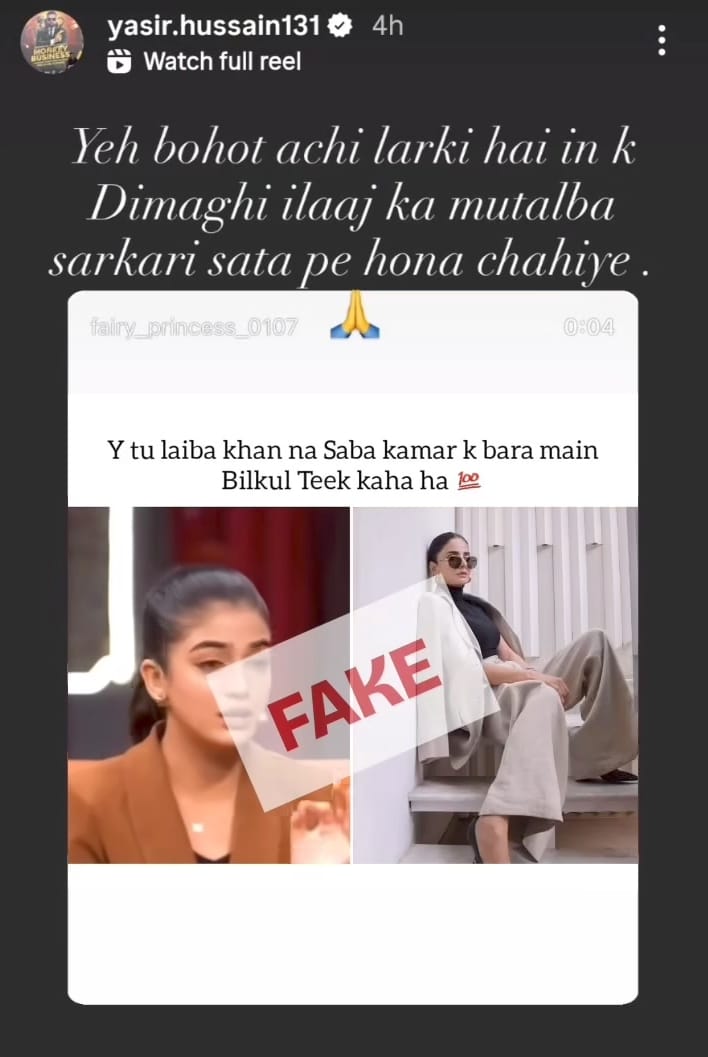 “People like @yasir.hussain131 made judgment about the fake one that went viral a year ago. Like Yasir Hussain, jinka khud dimagh kharab hai [whose own mind is not right], should’ve watched that show before passing judgment about me,” Laiba fired back in an Instagram story.
