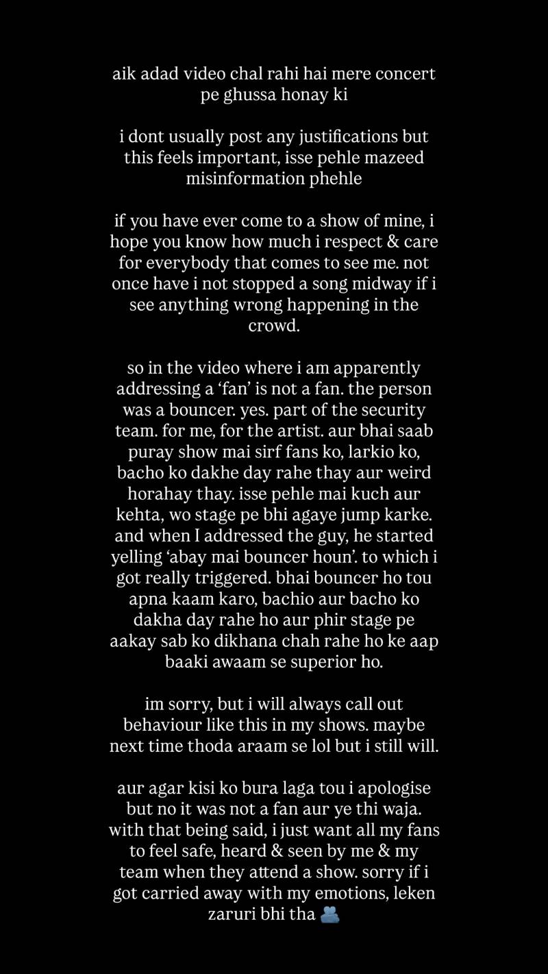 The singer explained that the individual he confronted, widely assumed to be a fan, was actually part of the security team. “In the video where I am apparently addressing a ‘fan,’ it is not a fan. The person was a bouncer, part of the security team,” Asim said.