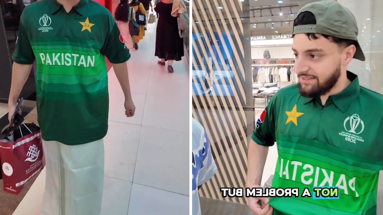 The video, shared by a creator named audisworld, captures him walking around in a Pakistan jersey and speaking to people on the street. During one interaction, he asks, “Is it a problem if I wear this?”