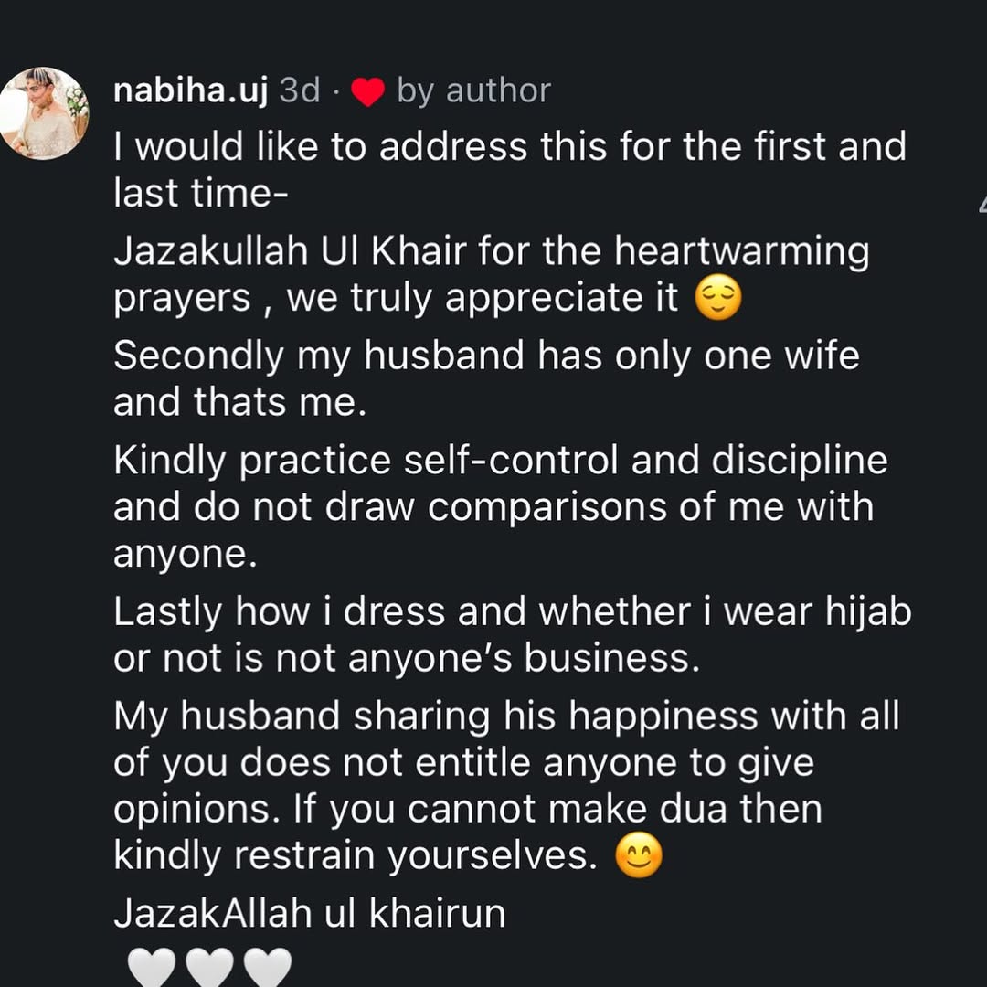 “I would like to address this for the first and last time – Jazakullah Ul Khair for the heartwarming prayers, we truly appreciate it,” she wrote. “Secondly, my husband has only one wife and that’s me. Kindly practice self-control and discipline and do not draw comparisons between me and anyone.”